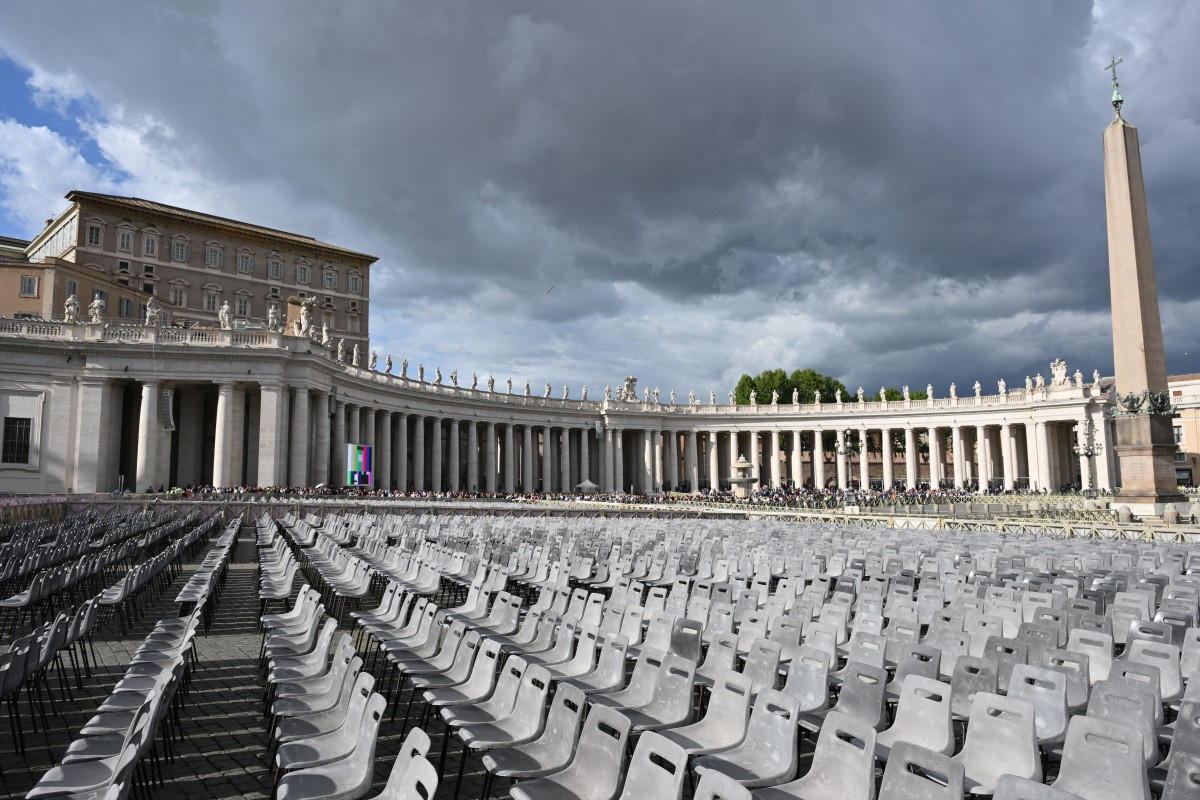 Những hàng ghế đã được xếp ngay ngắn tại quảng trường Thánh Peter, chuẩn bị cho Thánh lễ an táng Giáo hoàng Francis vào ngày 26-4 – Ảnh: AFP