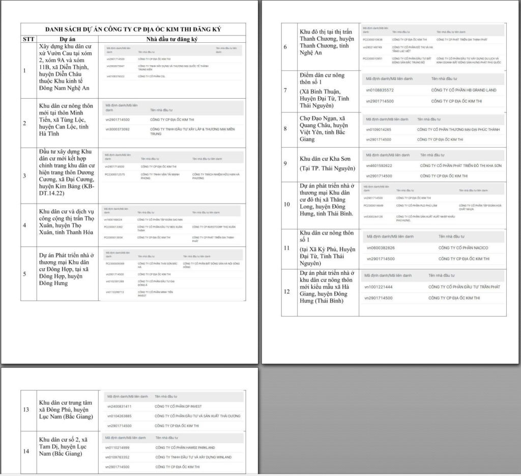 Theo đó, thống kê sơ bộ của MarketTimes từ thông tin đấu thầu lựa chọn nhà đầu tư dự án có sử dụng đất trên Công thông tin mua sắm công Quốc gia cho thấy hiện Công ty CP Địa ốc Kim Thi đang đồng thời đăng ký thực hiện đến 14 dự án tại các địa phương Bắc Giang, Thái Nguyên, Nghệ An, Hà Tĩnh, Thái Bình, Hà Nam, Thanh Hóa.