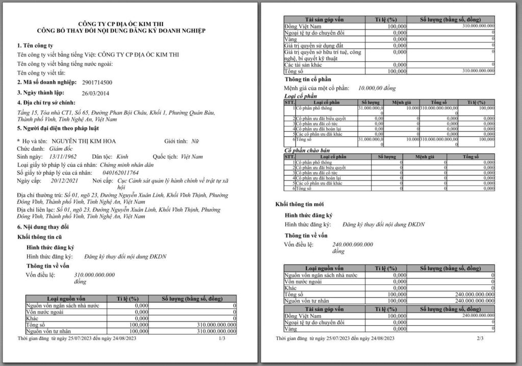 Trong khi đó, ở một diễn biến khác, ngày 24/7/2023, Công ty CP Địa ốc Kim Thi vừa mới giảm đáng kể vốn điều lệ của doanh nghiệp từ mức 310 tỷ đồng xuống 240 tỷ đồng.