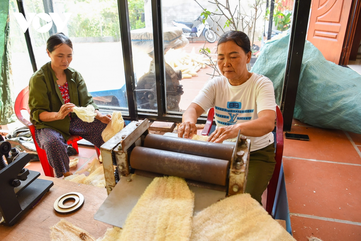 Bà Nguyễn Thị Á (áo trắng) đang ép xơ mướp sau khi đã được phơi khô rồi chuyển qua công đoạn xử lý thành phẩm tiếp theo.