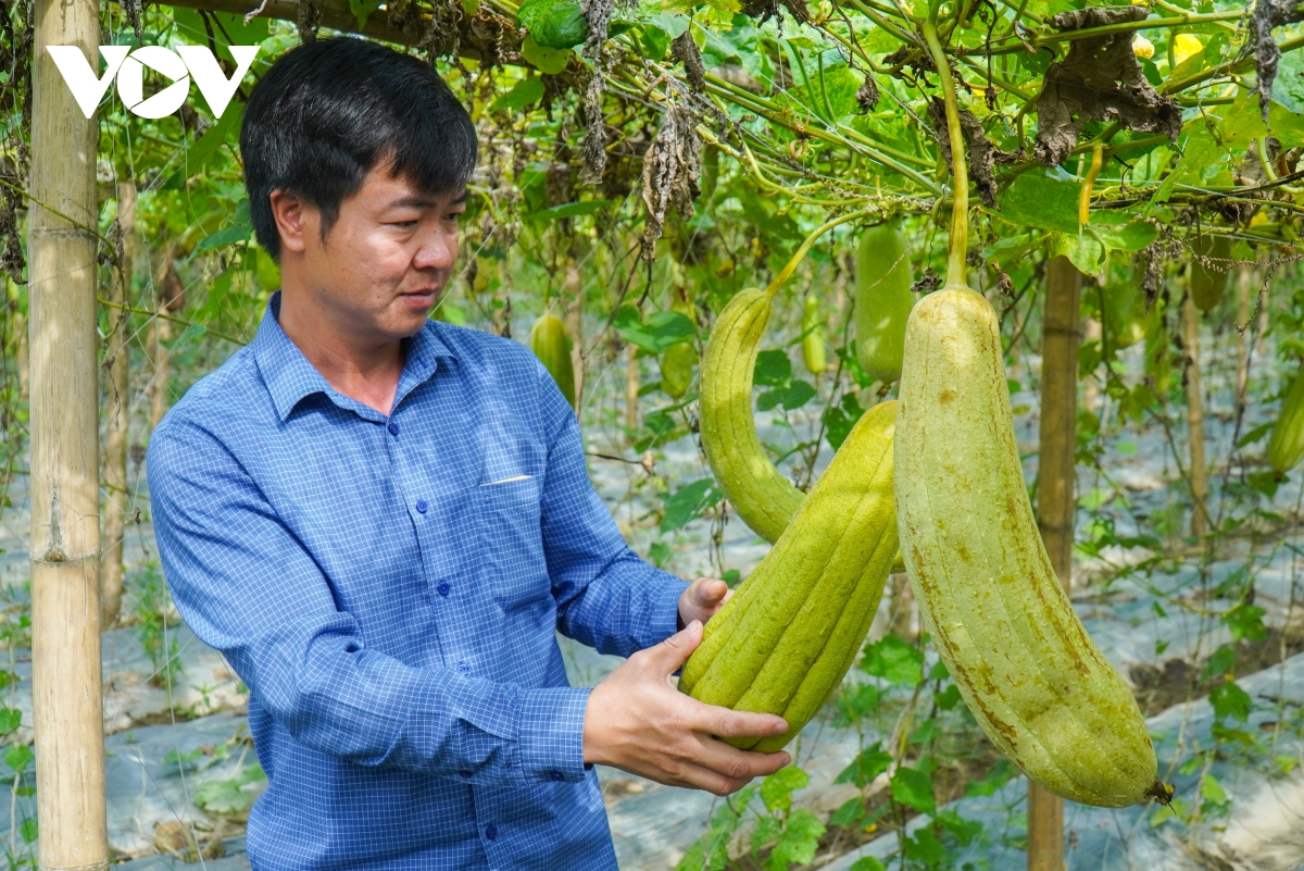Anh Tạ Quý Tôn đang kiểm tra những quả mướp đã đạt chất lượng để lấy xơ.
