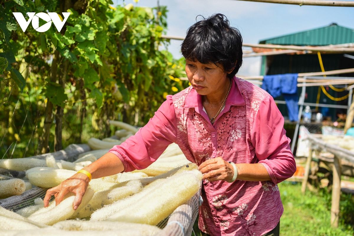 Công đoạn phơi vỏ xơ mướp đòi hỏi người thợ phải trau truốt tỉ mỉ.