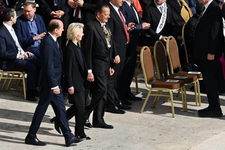 Chủ tịch Ủy ban Châu Âu (EC) Ursula Von der Leyen (giữa) tiến vào quảng trường Thánh Peter – Ảnh: AFP