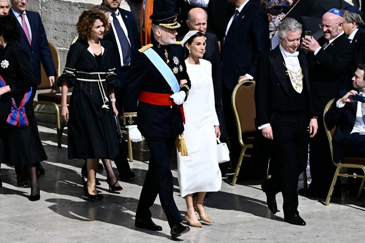 Vua Tây Ban Nha Felipe VI và Vương hậu Letizia thanh lịch trong bộ trang phục chuẩn hoàng gia đang tìm ghế ngồi của mình ở khu vực dành cho khách mời – Ảnh: AFP