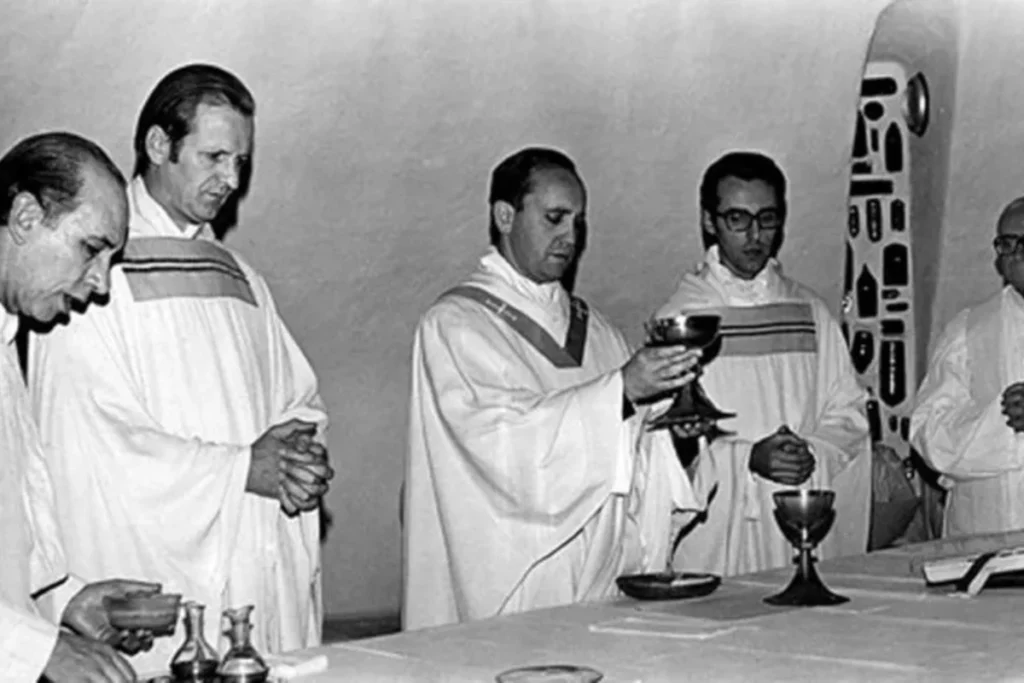 Giám tỉnh Bergolio cầm chén thánh làm lễ tại chủng viện San Miguel, Buenos Aires, năm 1976. Bốn năm sau, ông trở thành người đứng đầu chủng viện.