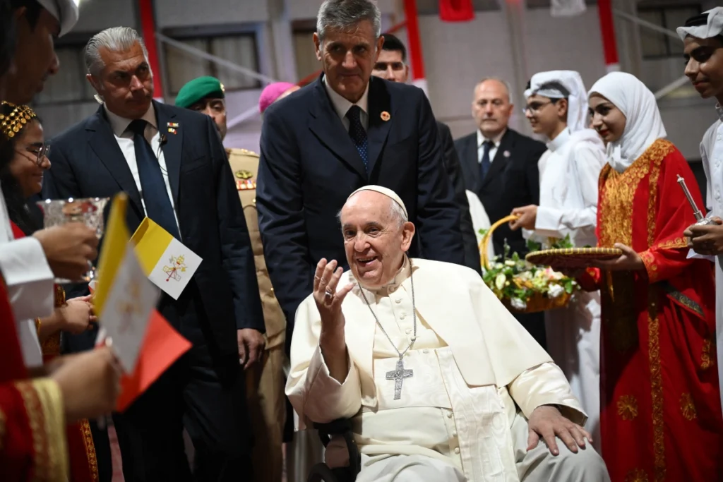 Các học sinh mặc trang phục truyền thống Hồi giáo tại Manama, thủ đô Bahrain đón Giáo hoàng Francis ngày 5/11/2022.