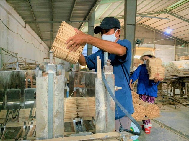 Công nhân tại HTX mây tre An Khê sử dụng máy chà bóng tăng tính thẩm mỹ của sản phẩm – Ảnh: VGP/Minh Trang