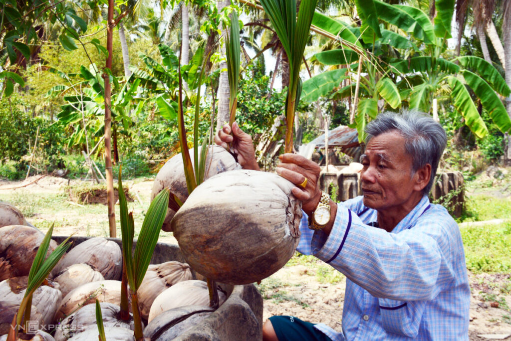 “Đường sụt lún, kênh cạn nước thương lái không vào mua nông sản được. Ba tháng nay thu nhập gia đình bị ảnh hưởng nghiêm trọng”, lão nông nói, cho biết chuối chỉ để chim ăn, còn dừa lên mộng phải bỏ.