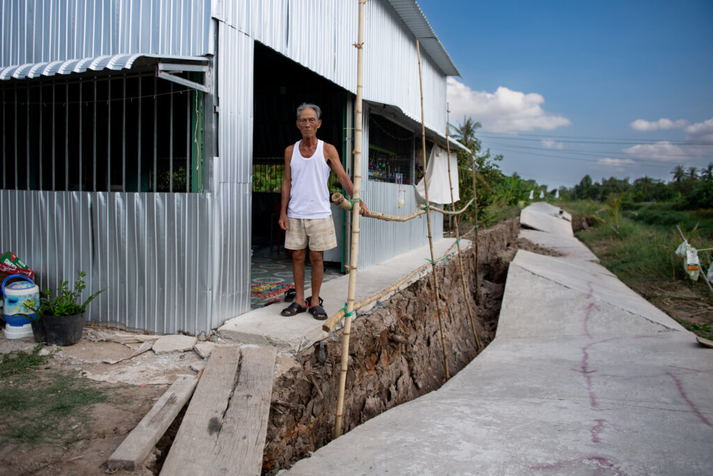 Cách thị trấn hơn 20 km, nhiều hộ dân sống ven Kinh Giữa, xã Khánh Hải lo lắng khi nhiều đoạn liên tiếp sạt lở sát nhà. Ông Võ Văn Triệu, 77 tuổi, đứng bên hàng rào tạm bợ bằng cây tre trước nhà, cạnh đoạn sạt lở dài hơn 30 m, sâu gần 2 m.