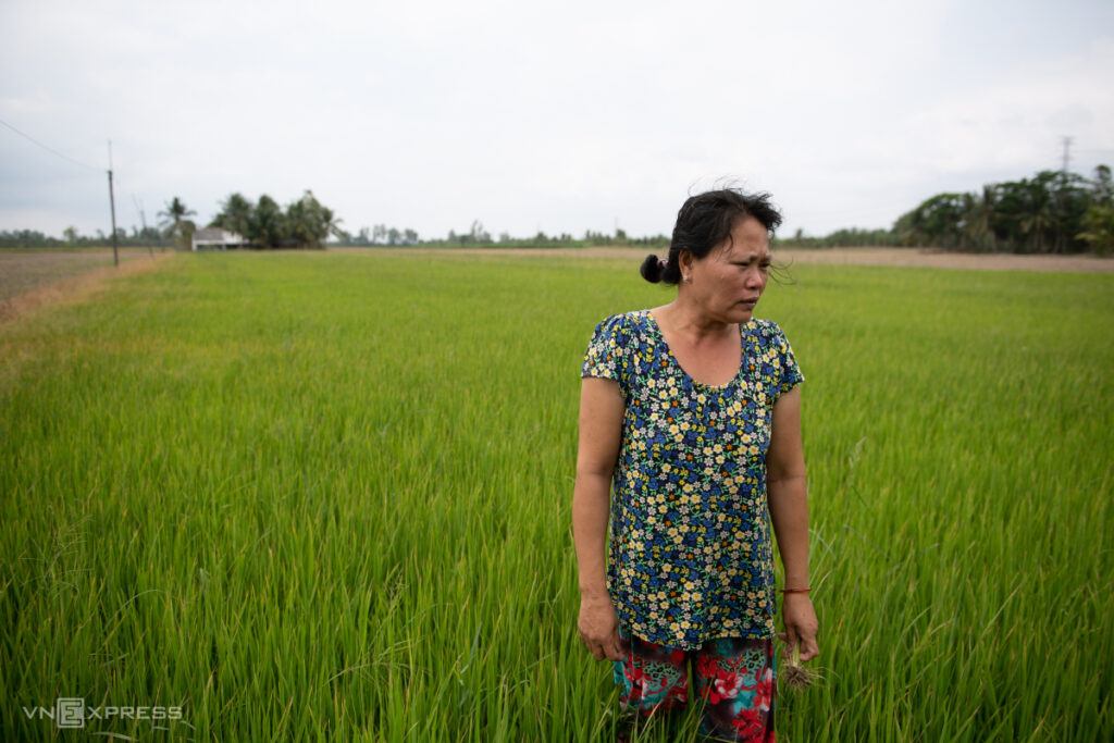 Đứng bên đám lúa đang trong giai đoạn làm đòng bị èo uột, lá cháy vàng, bà Trần Thị Hằng, 53 tuổi, ấp Tân Hưng, xã Long Đức, cho biết thửa ruộng một ha bị thiếu nước khoảng một tháng nay. “Tiền giống, phân thuốc hơn 10 triệu đồng đã đổ xuống, xới bỏ thì tiếc đứt ruột nên tôi bàn với chồng bơm nước mặn vào ruộng, hy vọng lúa hồi sinh để vớt vát chút đỉnh vốn”, bà nói.