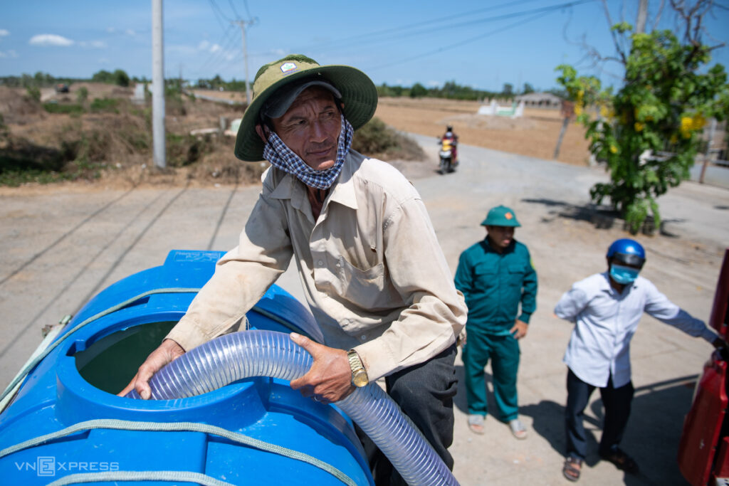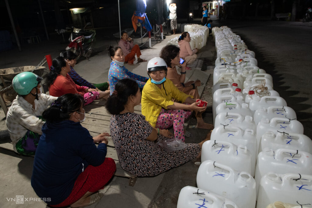Cả ngày đêm, người dân dùng các loại can 20-30 lít để lấy nước. Họ cho biết khu vực này không có nước máy, nguồn nước sinh hoạt chủ yếu dựa vào nước kênh nhưng suốt nhiều tháng qua không có mưa khiến kênh rạch khô cạn. Mọi người trong nhà đều thay phiên nhau chở nước từ các trạm tiếp nước cách nhà vài trăm mét hoặc chờ các xe chở nước từ thiện.