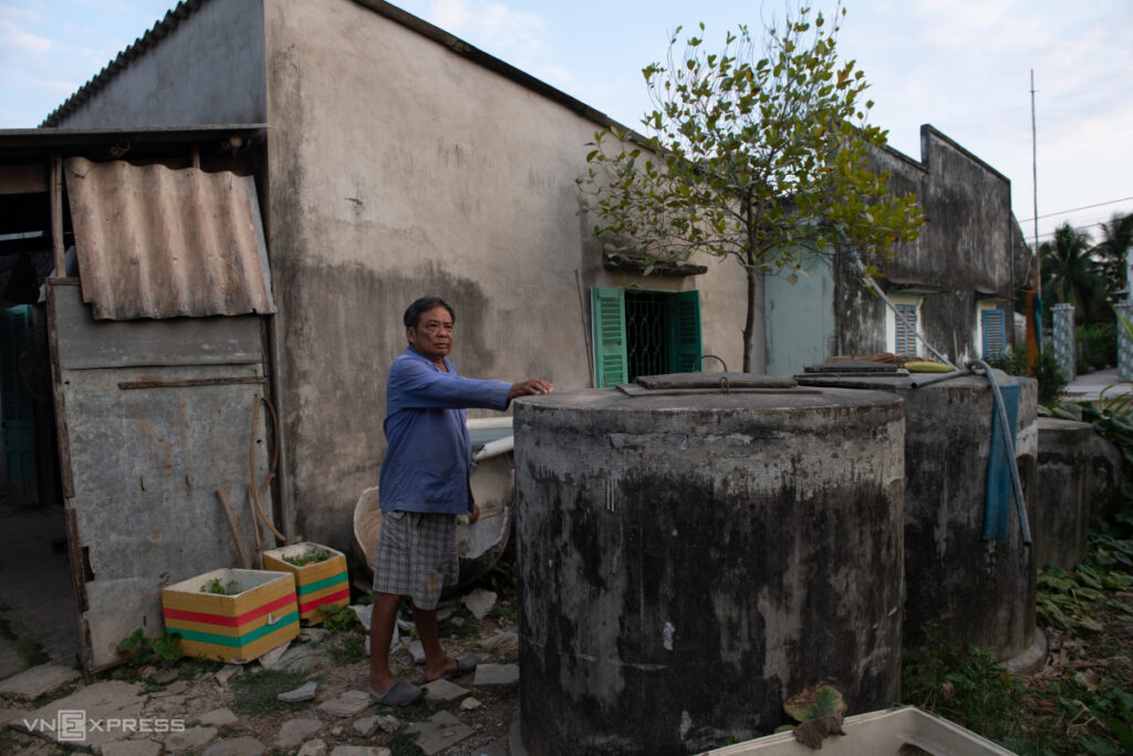 Nhà có 3 bể xi măng và nhiều lu chứa nước mưa để dành uống, nhưng do kênh khô cạn, gia đình ông Phạm Văn Đôi, 74 tuổi, xã Tân Phước, phải dùng cho cả sinh hoạt hàng ngày. “Mấy tháng nay không mưa, nước trong bồn cũng cạn rồi phải ra chợ mua nước về uống”, ông Đôi nói.