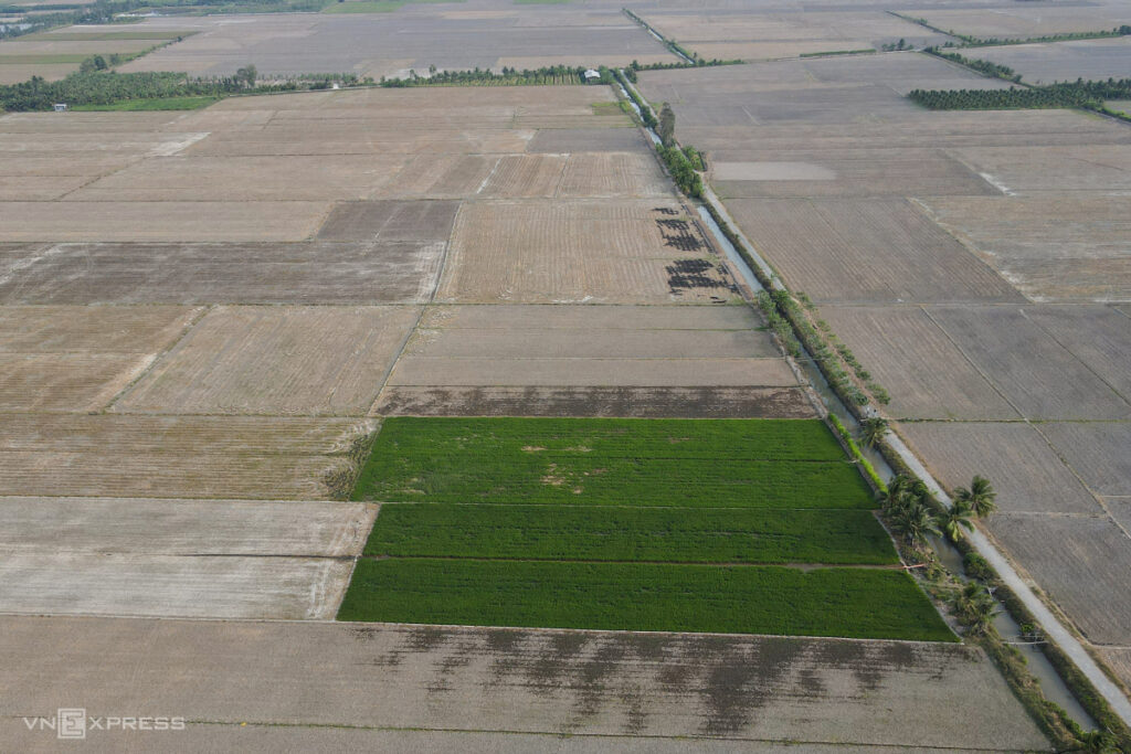 Cũng như bà Hằng, mảnh ruộng 5.000 m2 của ông Võ Trần Thanh Sang (54 tuổi) gần đó cũng thiếu nước sau một tháng gieo sạ. Hiện cây lúa đã chết khô, chỉ còn lại vài bụi lác đác bên cạnh mặt ruộng khô nứt nẻ. Tốn chi phí đầu tư hơn chục triệu, gia đình ông chuẩn bị xới bỏ.