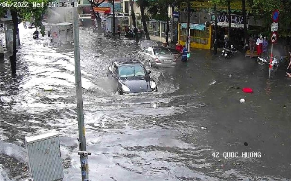 Tại đường Quốc Hương (Phường Thảo Điền, Thành phố Thủ Đức), một đoạn đường dài khoảng 500m ngập khoảng 40cm khiến xe cộ di chuyển khó khăn.