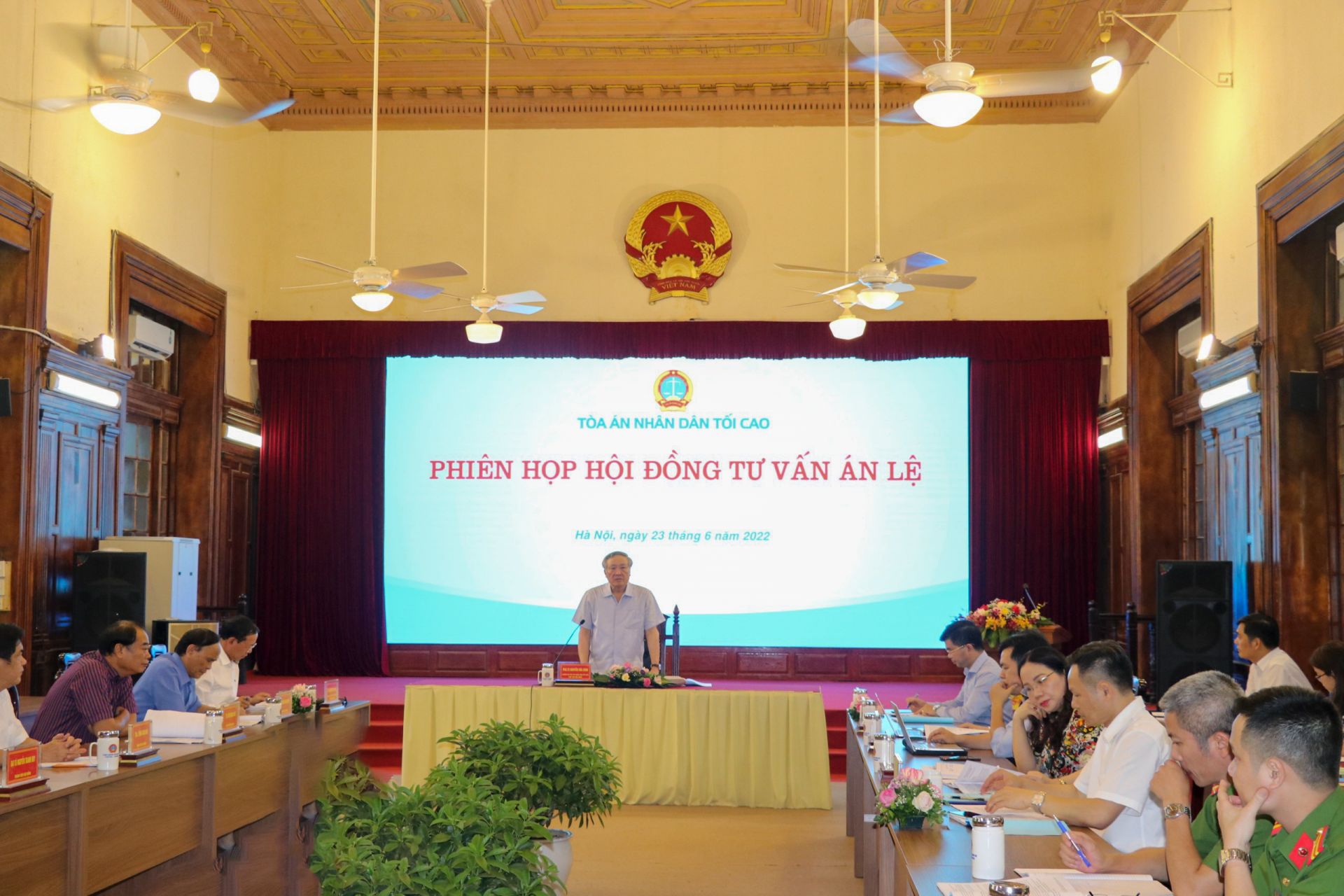 Chiều 23/6, TANDTC tổ chức Phiên họp Hội đồng tư vấn án lệ nhằm thảo luận, cho ý kiến đối với nội dung của với 14 dự thảo án lệ. PGS.TS. Nguyễn Hòa Bình, Ủy viên Bộ Chính trị, Bí thư Trung ương Đảng, Chánh án TANDTC, Chủ tịch Hội đồng Tư vấn án lệ chủ trì.