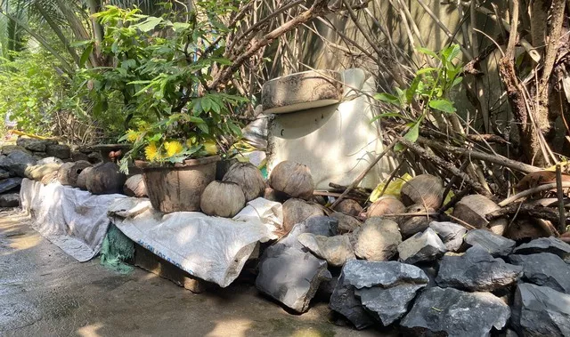 Gáo dừa, trái dừa ở sân vườn nhà dân cũng chứa nước mưa và lăng quăng.