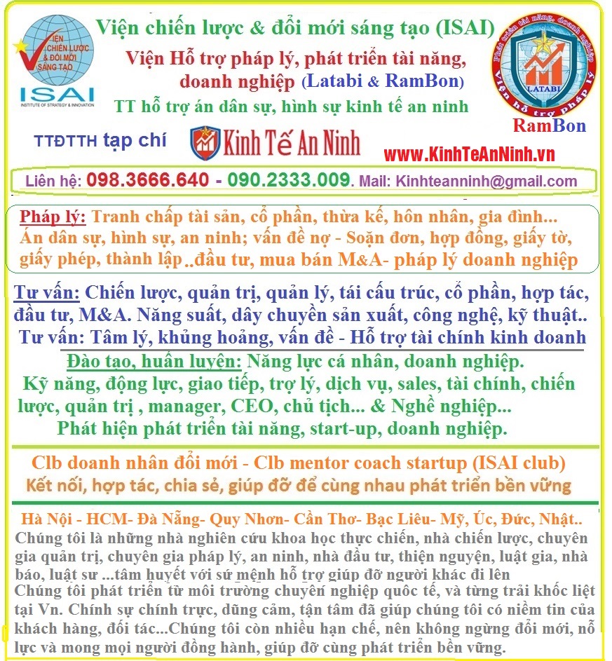 Ngoài ra Viện chiến lược & đổi mới sáng tạo (ISAI) và Viện hỗ trợ pháp lý, phát triển tài năng, doanh nghiệp (RAMBON) là hai tổ chức hàng đầu, với chất lượng tương đương các tổ chức tư vấn hàng đầu của Mỹ, Âu. chuyên tư vấn chiến lược, tái cấu trúc, tư vấn hệ thống quản trị, quản lý và đổi mới sáng tạo, tư vấn đầu tư. Tư vấn IPO trong và ngoài nước. Đào tạo huấn luyện phát triển tài năng, doanh nghiệp và các khóa đào tạo kỹ năng, giám đốc kinh doanh, giám đốc marketing, CEO, Chủ tịch, khởi nghiệp. Hỗ trợ pháp lý doanh nghiệp, dân sự, hình sự. Đã từng giúp nhiều doanh nghiệp phát triển mạnh mẽ. Luôn sẵn sàng giúp các doanh nghiệp có dịch vụ tư vấn phù hợp giúp mình phát triển bền vững (quý doanh nghiệp có thể quy phí tư vấn thành cổ phần).