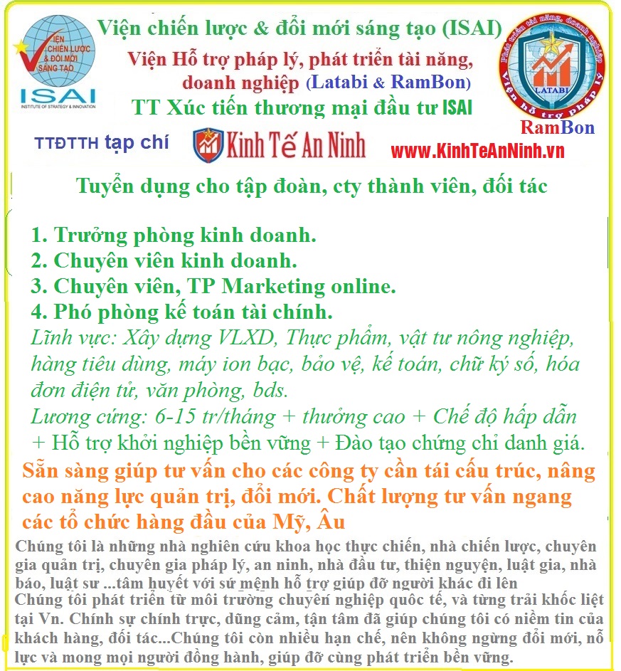 Trung tâm xúc tiến thương mại đầu tư Viện ISAI, thông báo tuyển dụng cho các tập đoàn, doanh nghiệp thành viên, đối tác hoạt động trong các lĩnh vực như xây dựng, vlxd, cơ khí, thực phẩm, vật tư nông nghiệp, bảo vệ vệ sĩ, cho thuê văn phòng, bds, hàng tiêu dùng, nhà hàng, máy nước ion bạc, kiềm như sau:
