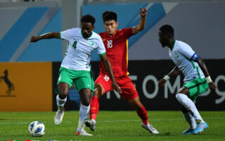 Cán đích ở vị trí nhất bảng D, U23 Ả rập Xê út (trắng) trở thành đối thủ của U23 Việt Nam tại tứ kết. Ảnh: Hiếu Lương